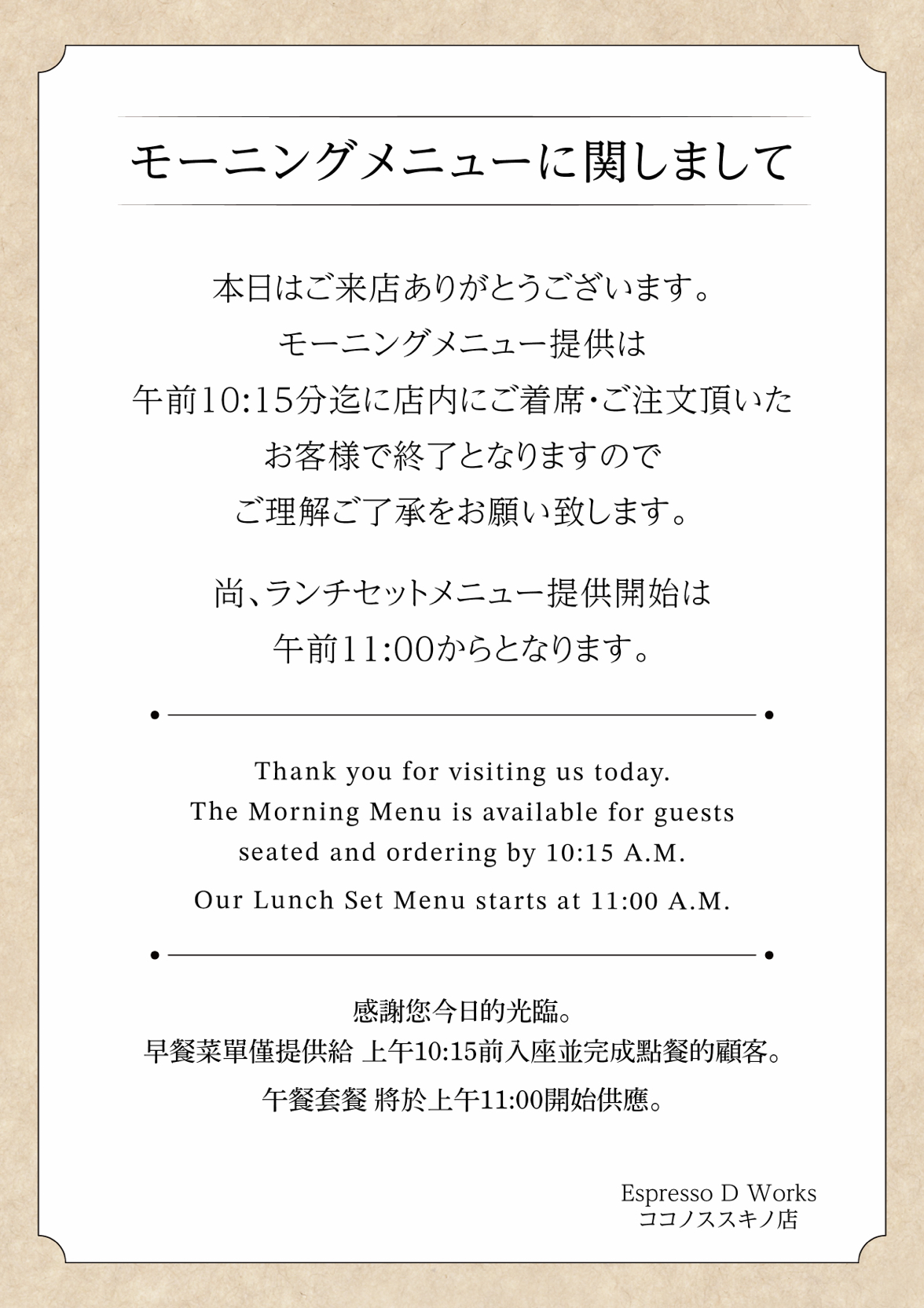 8:00-17:00の営業時間は”Espresso D Works”として、”世界の初の食パン100 One Hundred”、”天使のクロワッサン”などこだわりのさまざまなパンや、季節でメニューが変わるパスタやふわふわパンケーキをお楽しみいただけます。「ESPRESSO D WORKS」。